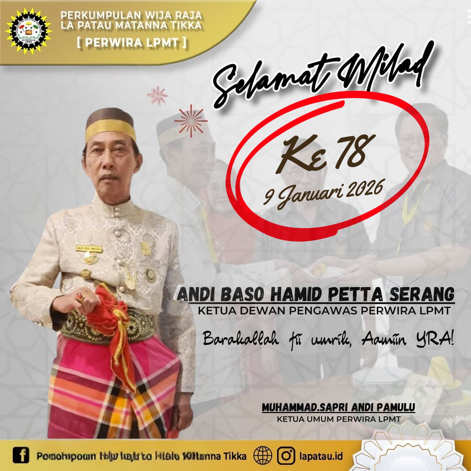 Selamat Milad ke-78 Andi Baso Hamid Petta Serang, Ketua Dewan Pengawas Perkumpulan Wija Raja La Patau Matanna Tikka [PERWIRA LPMT]. Andi Baso Hamid, lahir di